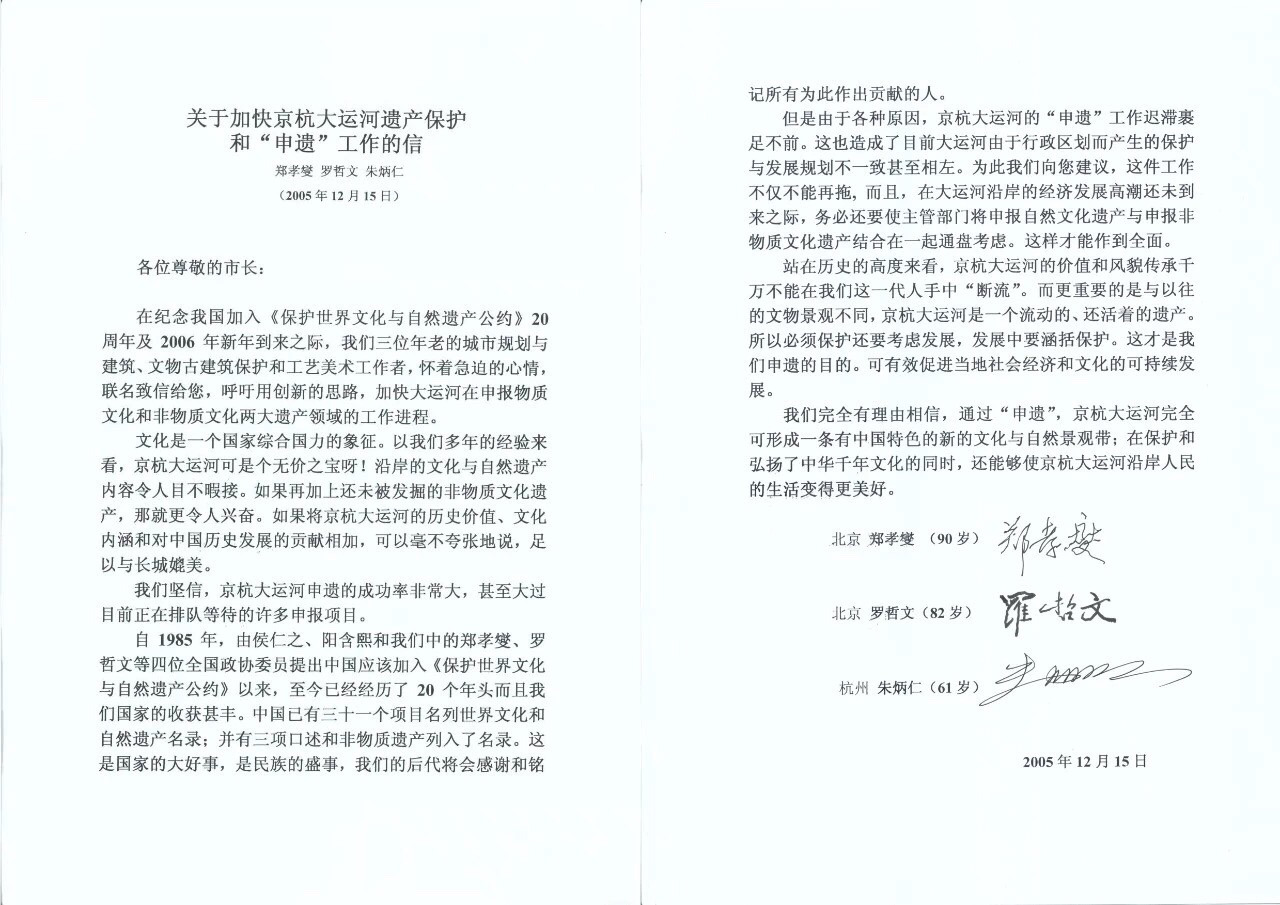 2005年12月15日,一封承载着三位老者赤子之心的《关于加快京杭大运河遗产保护和“申遗”工作的信》,跨越千里山河,送达运河沿线18座城市的市长案头。时年90岁的古建筑保护专家郑孝燮、82岁的古建学家罗哲文与61岁的工艺美术大师朱炳仁,以“运河三老”之名,在信中疾呼:“京杭大运河可是个无价之宝呀!”这封800余字的信函,如同一声穿越时空的号角,打破了大运河申遗长期停滞的僵局,推动这场关乎文化根脉的事业从专家呼吁走向国家行动。20年后的今天,当我们回望这段波澜壮阔的历程,那纸笔墨间的赤诚与担当,依然闪耀着照亮文明传承之路的光芒。